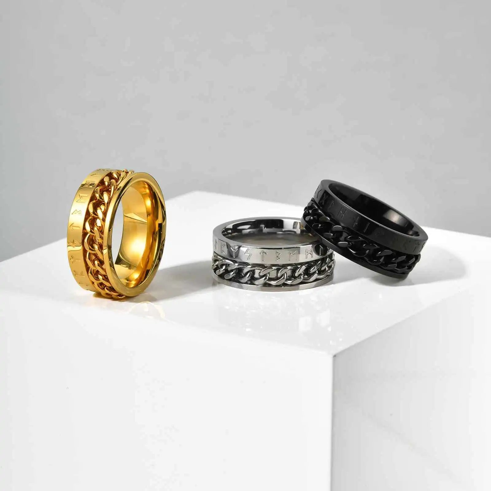Carry the strength of Viking heritage with this stylish rune chain ring. Crafted from durable stainless steel, the 8mm wide band features detailed rune engravings and a unique turnable chain design that adds both style and function. Available in black, gold, or silver tones, this bold piece makes a meaningful gift for husbands, sons, fathers, or anyone who appreciates Norse-inspired jewelry.