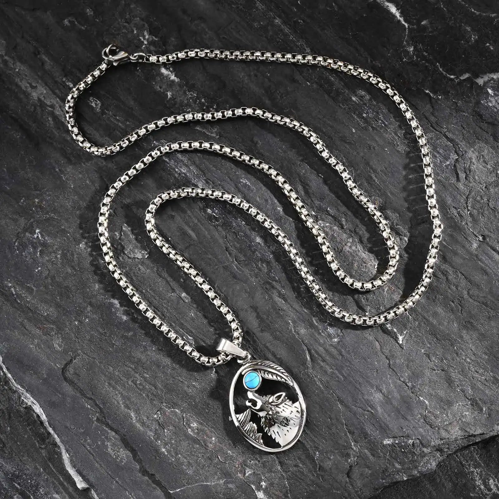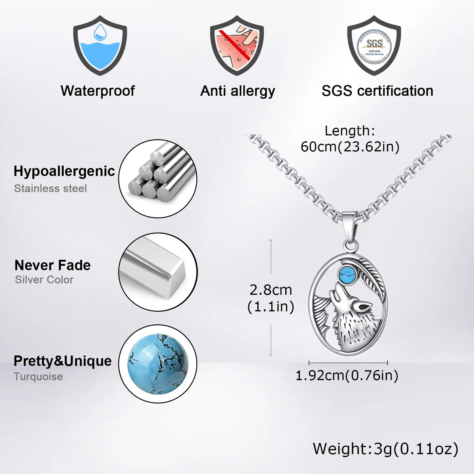 Unleash bold style with this wolf head turquoise pendant necklace, a powerful symbol of strength and independence. The detailed stainless steel wolf design embraces a striking turquoise stone, blending ethnic-inspired artistry with modern edge. Paired with an adjustable box chain, it offers both durability and versatile wear. Perfect as a unique gift for men who appreciate symbolic and stylish jewelry.